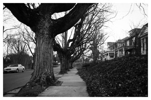 In this monochrome landscape, towering trees stretch their gnarled limbs towards a fading sky, evoking a sense of solitude and contemplation. The crisp sidewalk leads the eye along the quiet street, framed by modest homes that hint at stories untold. The soft, diffused lighting enhances the melancholic mood, inviting viewers to reflect on the quiet beauty of a late autumn day.