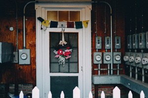 The photograph captures a quaint entrance adorned with a floral wreath, creating a welcoming contrast against the utilitarian backdrop of electric meters. Soft lighting enhances the wood's texture, while the colorful prayer flags add a touch of cultural vibrancy, imbuing the scene with a warm and inviting mood. The composition effectively balances domestic charm and urban energy, drawing the viewer's eye towards the door marked with the number 34.