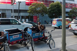 In a bustling city street, two rickshaw drivers take a moment to unwind, lounging in their colorful bikes. The vibrant energy of the surroundings contrasts with their relaxed demeanor, highlighted by soft afternoon light filtering through nearby trees. The composition captures a snapshot of urban life, merging movement and stillness in an engaging tableau.