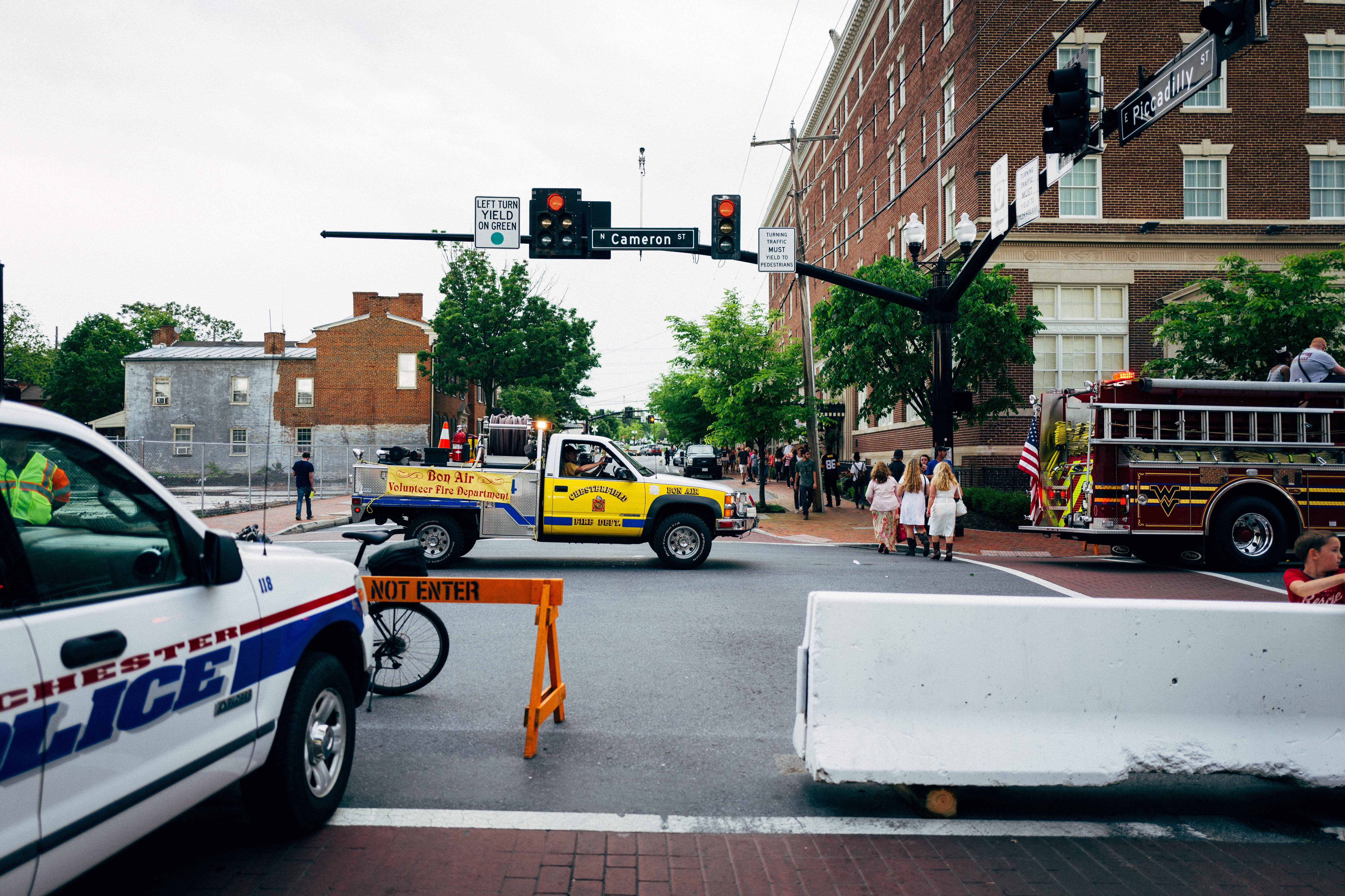 The photograph captures a bustling urban intersection, showcasing a blend of public service vehicles amidst a crowd of pedestrians. The overcast sky sets a subdued mood, while the presence of police and fire trucks emphasizes a sense of community readiness. Compositionally, the contrasting colors of the vehicles and the varied textures of the buildings lead the eye through the scene, evoking a dynamic yet organized urban life.