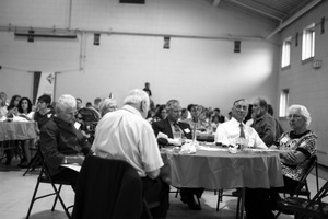 In a soft black-and-white palette, a group of older adults sits around tables draped in pastel cloth, deep in conversation yet lost in thought. The ambient lighting highlights their expressions, evoking a blend of nostalgia and camaraderie, while the gathering setting hints at a celebration or reunion. The composition draws the viewer in, capturing both the individuality of each participant and the collective spirit of the event.