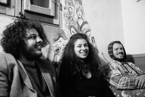 In a cozy room filled with artistic mural work, three friends sit closely together, sharing warm laughter. The black and white tones enhance the intimate mood, highlighting their expressions and the textured backdrop that tells a story of creativity and companionship. Soft lighting casts gentle shadows, creating an inviting atmosphere for their shared moment.