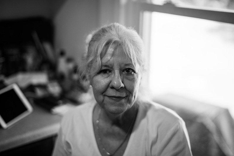 In this intimate black-and-white portrait, an older woman gazes softly at the viewer, exuding warmth and contemplation. The soft, natural light beautifully highlights her gentle features and silver hair, while the blurred background suggests a cozy, lived-in space. The overall mood is serene and reflective, inviting a sense of connection and understanding.