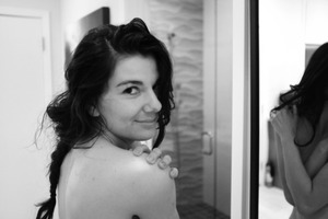 In this intimate black-and-white portrait, a woman glances back over her shoulder with a playful smile, her bare skin partially obscured by her arm. The soft lighting creates a gentle, inviting mood, while the textured background and reflections add depth to the composition. The overall atmosphere is both candid and serene, capturing a moment of self-assurance and beauty.