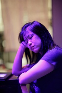 In this intimate portrait, a young woman rests her head in her hand, her eyes closed in a moment of quiet reflection. The soft, purple lighting casts a serene and almost ethereal mood, highlighting her peaceful expression against a blurred background. The composition draws the viewer in, creating a sense of calm and introspection amidst a vibrant atmosphere.