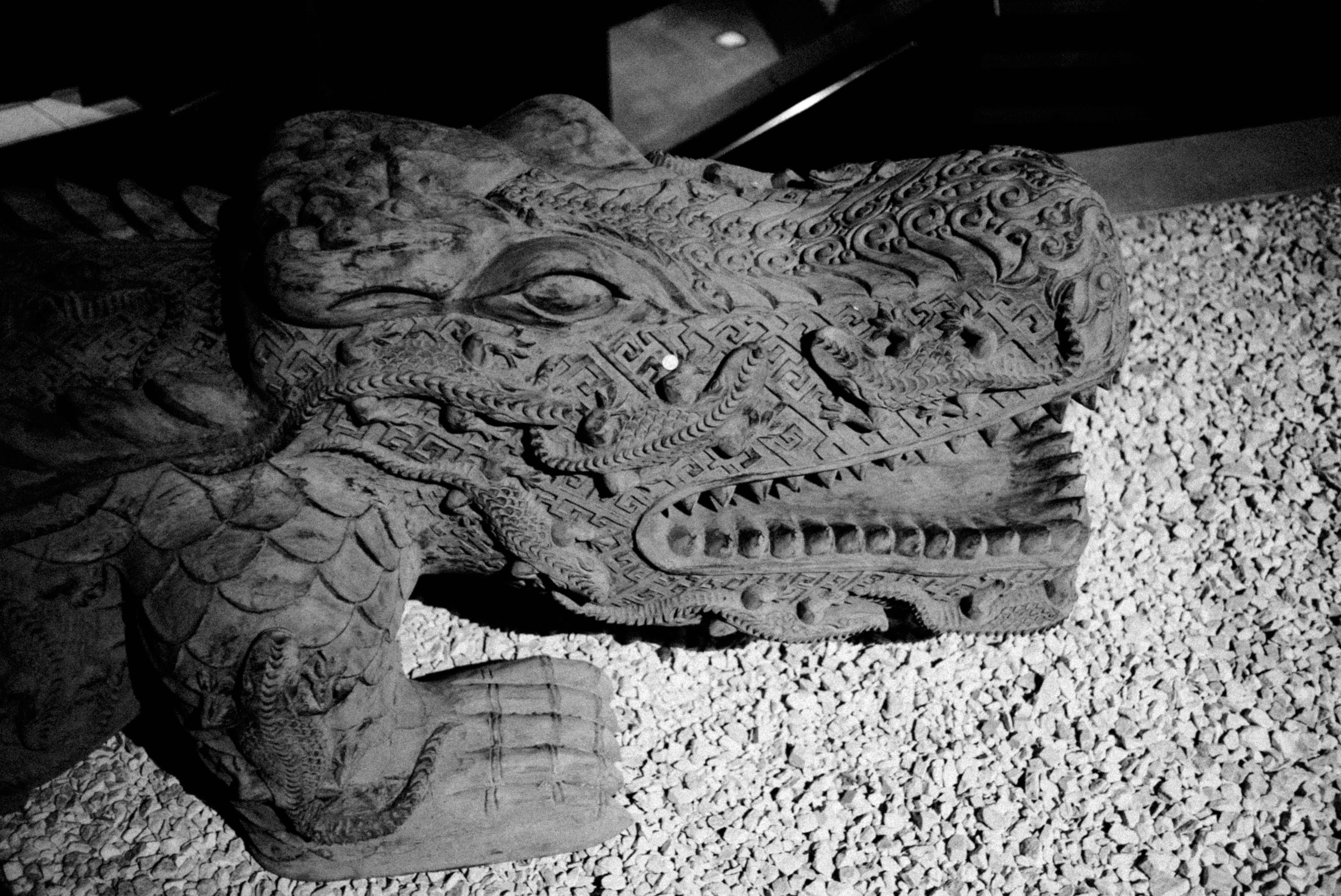 This striking photograph features a beautifully carved stone sculpture resembling a dragon or mythical guardian. The stark black-and-white lighting accentuates the intricate details and textures, creating a dramatic contrast that evokes a sense of ancient mystique. Set against a minimalistic background, the sculpture commands attention, inviting viewers to reflect on its rich cultural significance.