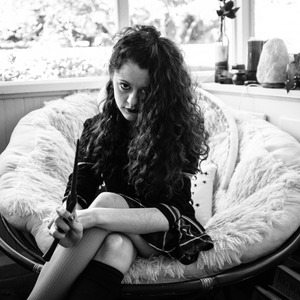 In a cozy, softly lit space, a young woman exudes an air of confidence and mystery, seated in a plush, circular chair. Her intense gaze, coupled with the stark contrast of black and white photography, creates a compelling tension, enhanced by her unconventional attire and the dark pencil she holds. The natural light filtering through the window casts gentle shadows, accentuating her expressive features and the textured surroundings, adding depth to the scene.