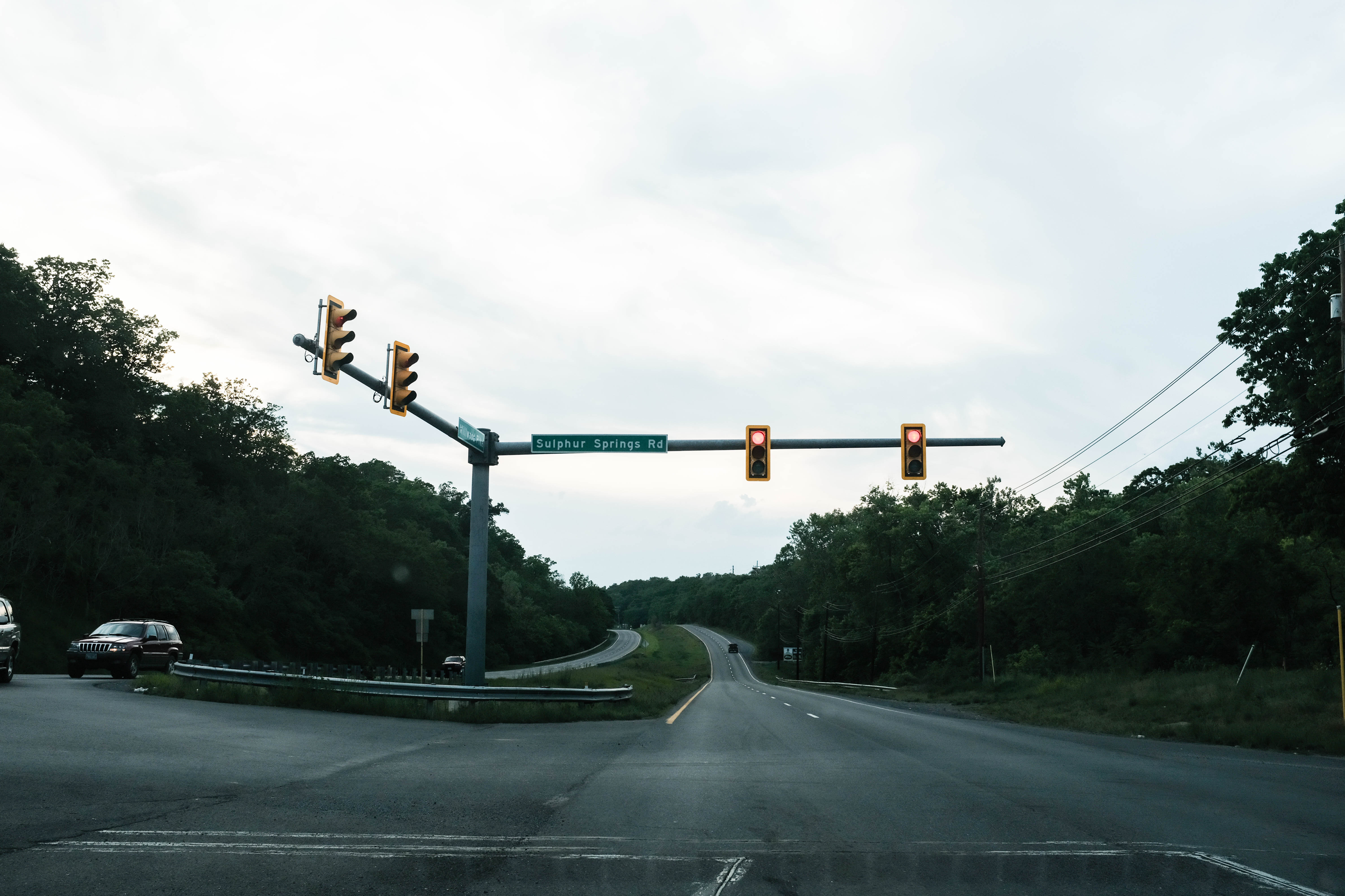 The photograph captures a quiet intersection under a soft, overcast sky, evoking a sense of calm and stillness. Traffic lights glow red against the muted hues of the landscape, suggesting a pause in motion. Lush greenery flanks the roads, contrasting with the asphalt and hinting at a tranquil, yet uncertain journey ahead.