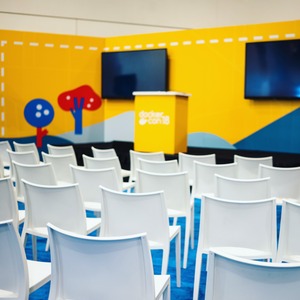 This photograph captures a vibrant conference setting, marked by a bright yellow backdrop adorned with playful graphics and sleek modern chairs. The composition conveys an anticipatory mood, with the neatly arranged rows of empty chairs facing a podium, inviting an audience that has yet to fill the space. The soft lighting enhances the cheerful atmosphere, suggesting a scene ready for engagement and inspiration.