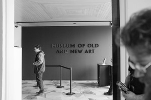 In this monochrome photograph, a visitor stands pensively at the entrance of the 'Museum of Old and New Art,' conveying a sense of curiosity and contemplation. The stark contrast between the dark wall text and the bright marble floor enhances the minimalist aesthetic, highlighting the space's modern design. Soft, diffused lighting creates a calm atmosphere, inviting exploration of the artistic contrasts within the museum.