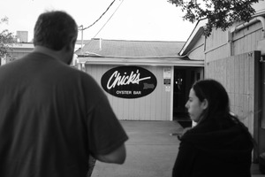 In this black-and-white photograph, two figures approach a charming oyster bar, their backs turned to the camera. The mood is contemplative, with a sense of anticipation suggested by the inviting sign ahead. Soft, diffused lighting enhances the simple, rustic charm of the scene, while the composition draws the viewer's eye towards the entrance of the bar, hinting at a cozy gathering place.