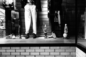 This photograph presents a stylishly curated window display, featuring impeccably dressed mannequin legs with a mix of casual and formal footwear. The use of monochrome enhances the nostalgic mood, paired with unique decor items like lava lamps, adding a playful contrast to the clothing. Soft lighting elegantly highlights the textures and shapes, creating a captivating visual narrative of urban fashion.