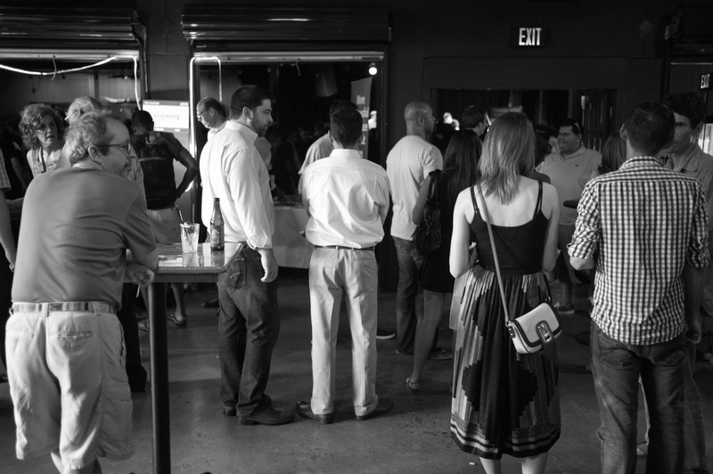In a dimly lit venue, a diverse group of people gathers in conversation, exuding an air of anticipation. The black-and-white composition heightens the mood, emphasizing the intimate yet lively atmosphere, as their body language hints at shared stories and connections waiting to unfold. The framing captures both the depth of the crowd and the subtle interactions, inviting the viewer into this vibrant social moment.