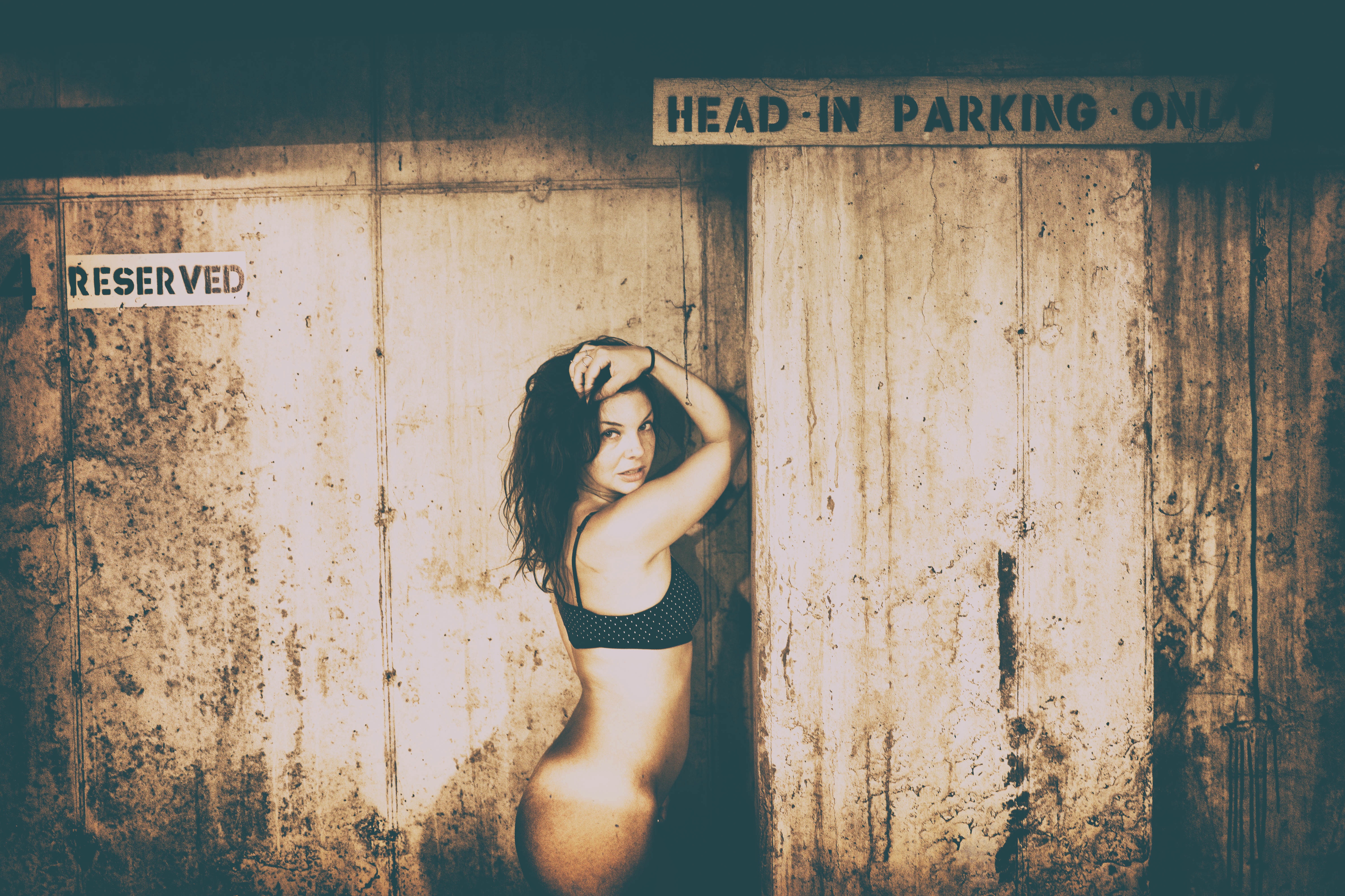 The photograph captures a striking figure against a rugged, peeling concrete backdrop, merging sensuality with a sense of gritty urban atmosphere. Soft, moody lighting accentuates the subject's contours and creates an intimate ambiance, while the juxtaposition of stark signage adds a touch of rebellion. The overall composition evokes a blend of vulnerability and strength, inviting the viewer to contemplate the duality of the setting and subject.