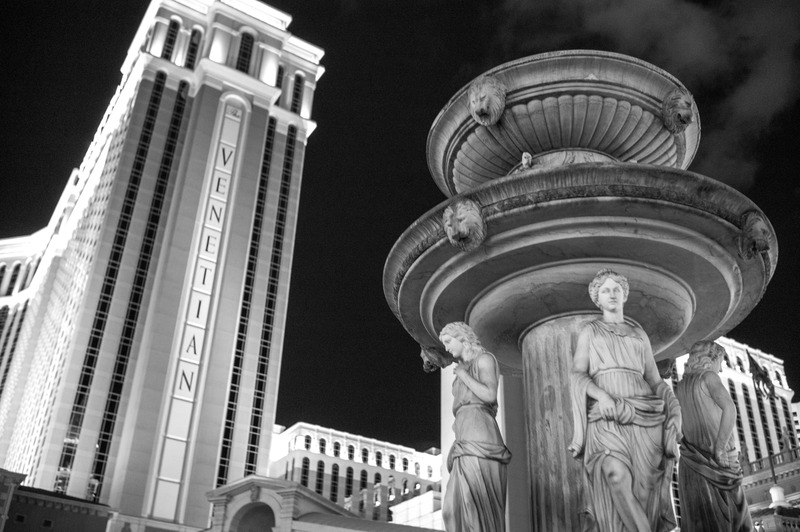 This striking black-and-white photograph captures a grand fountain adorned with classical sculptures, positioned prominently against the towering Venetian hotel. The contrast between the ornate details of the fountain and the modern architecture creates a dialogue between history and contemporary design. Soft lighting casts gentle shadows, enhancing the mood of timeless elegance amid the urban landscape.