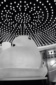 A whimsical giant marshmallow chick takes center stage, its soft contours contrasting with a mesmerizing array of bright lights above. The high-contrast black and white photography accentuates the playful mood while creating a surreal, dreamlike atmosphere. The upward perspective invites viewers to marvel at both the charming subject and the enchanting ambiance of the space.