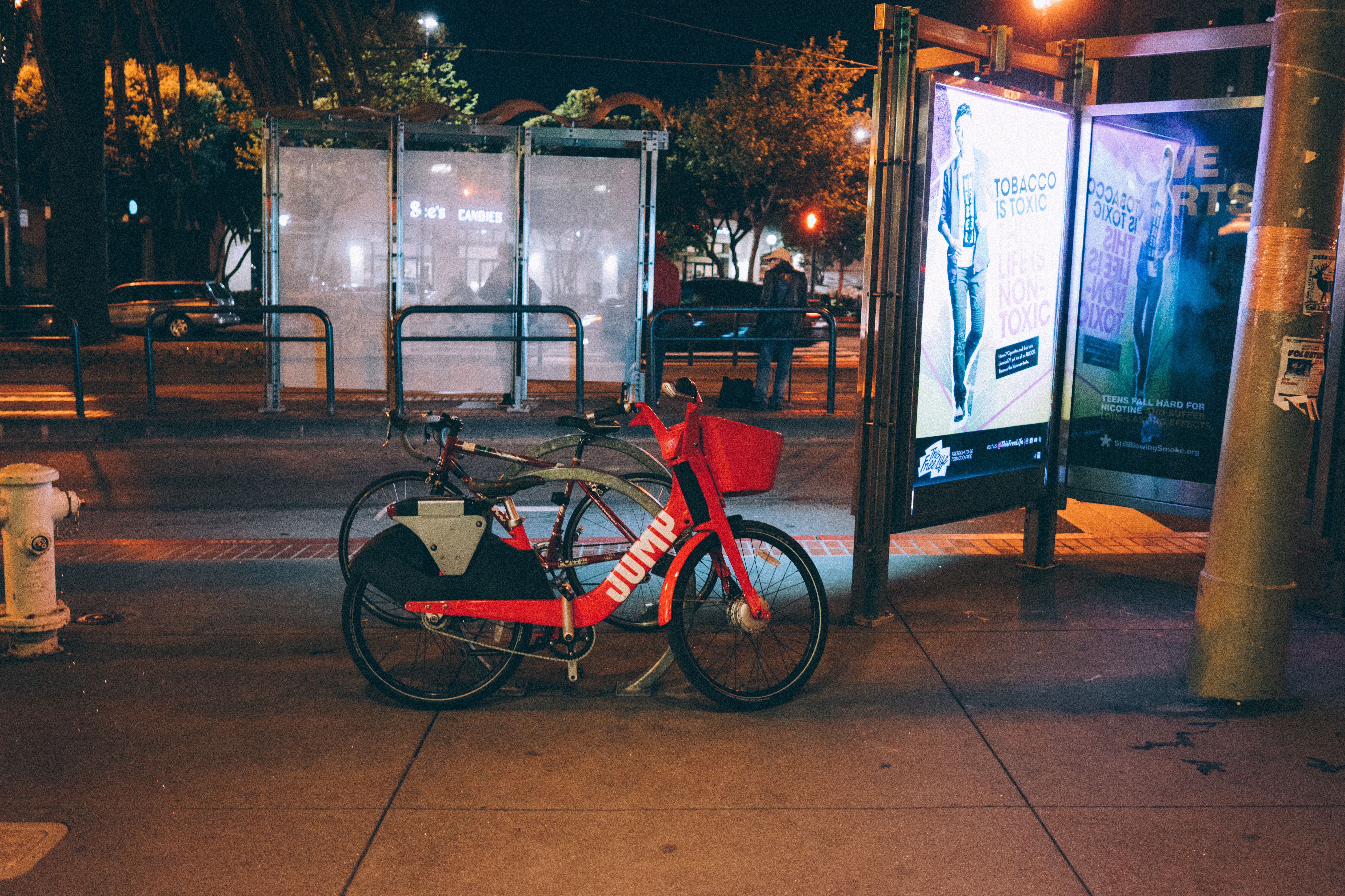 In a dimly lit urban setting, a conspicuous red bike stands parked, contrasting with the muted tones of its surroundings. The soft glow from nearby advertisements casts a vibrant light, enhancing the bike's presence while shadows loom ominously in the background. This scene captures a moment of stillness amid the nocturnal bustle, evoking a sense of urban solitude and fleeting opportunities.
