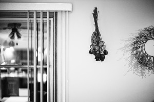 In a softly lit interior, dried roses hang elegantly against a muted wall, evoking nostalgia and warmth. The monochrome palette enhances the tranquil mood, while the window's vertical slats create a gentle division of space. A nearby wreath adds a touch of whimsy, balancing the composition with its circular form.