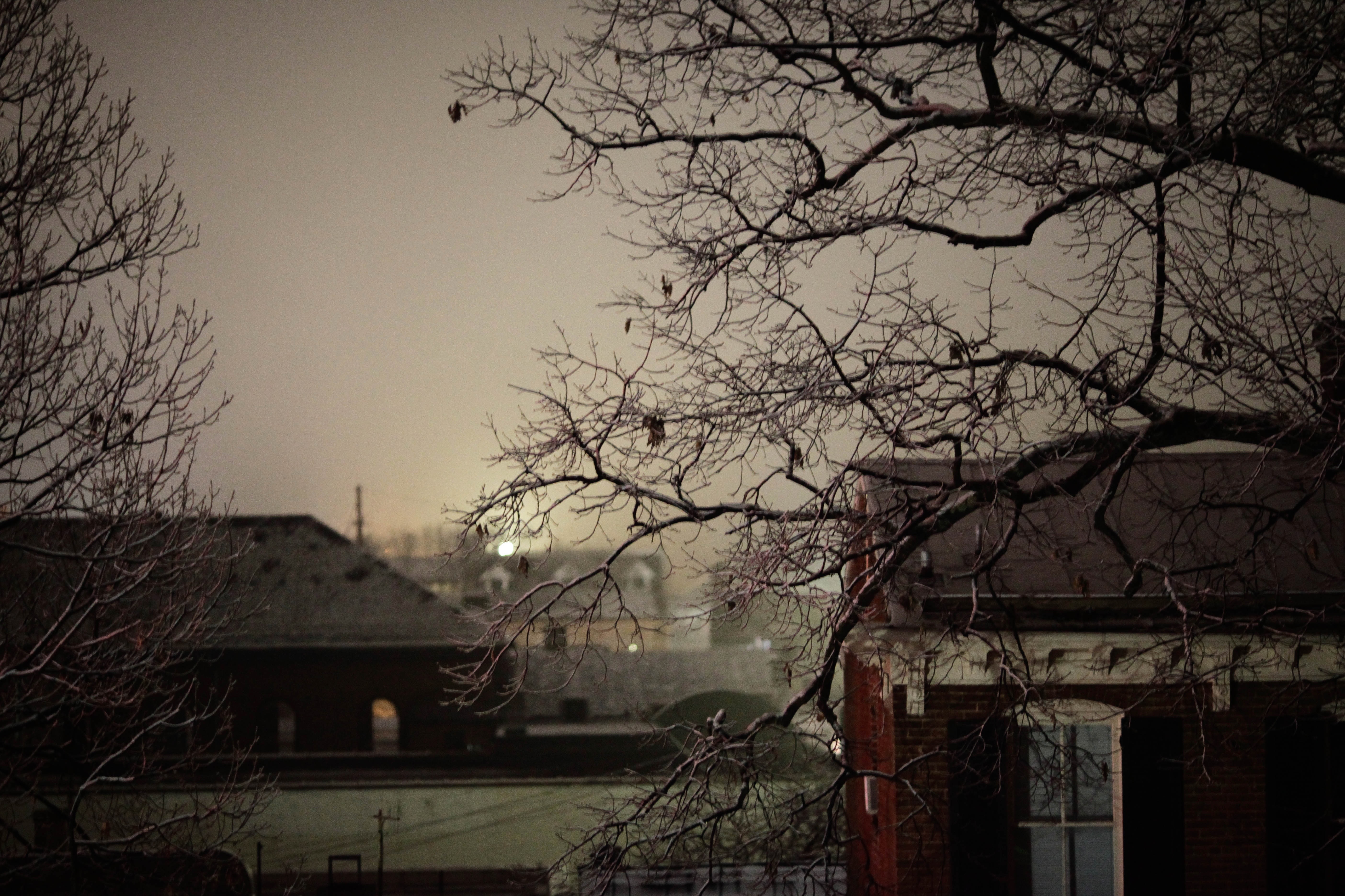 A haunting winter scene unfolds as bare branches reach towards a muted sky. The soft glow of distant lights contrasts with the darkness, creating an ethereal atmosphere. The composition captures a sense of quiet solitude, inviting contemplation amidst the chilly evening air.