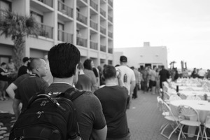 This black-and-white photograph captures a long queue of individuals, each facing away, seemingly lost in thought. The composition highlights the uniformity of their posture and clothing, evoking a sense of anticipation and camaraderie amidst the muted backdrop of the hotel and outdoor setting. Soft natural light filters through, adding a contemplative atmosphere to the scene as attendees await an engaging event.