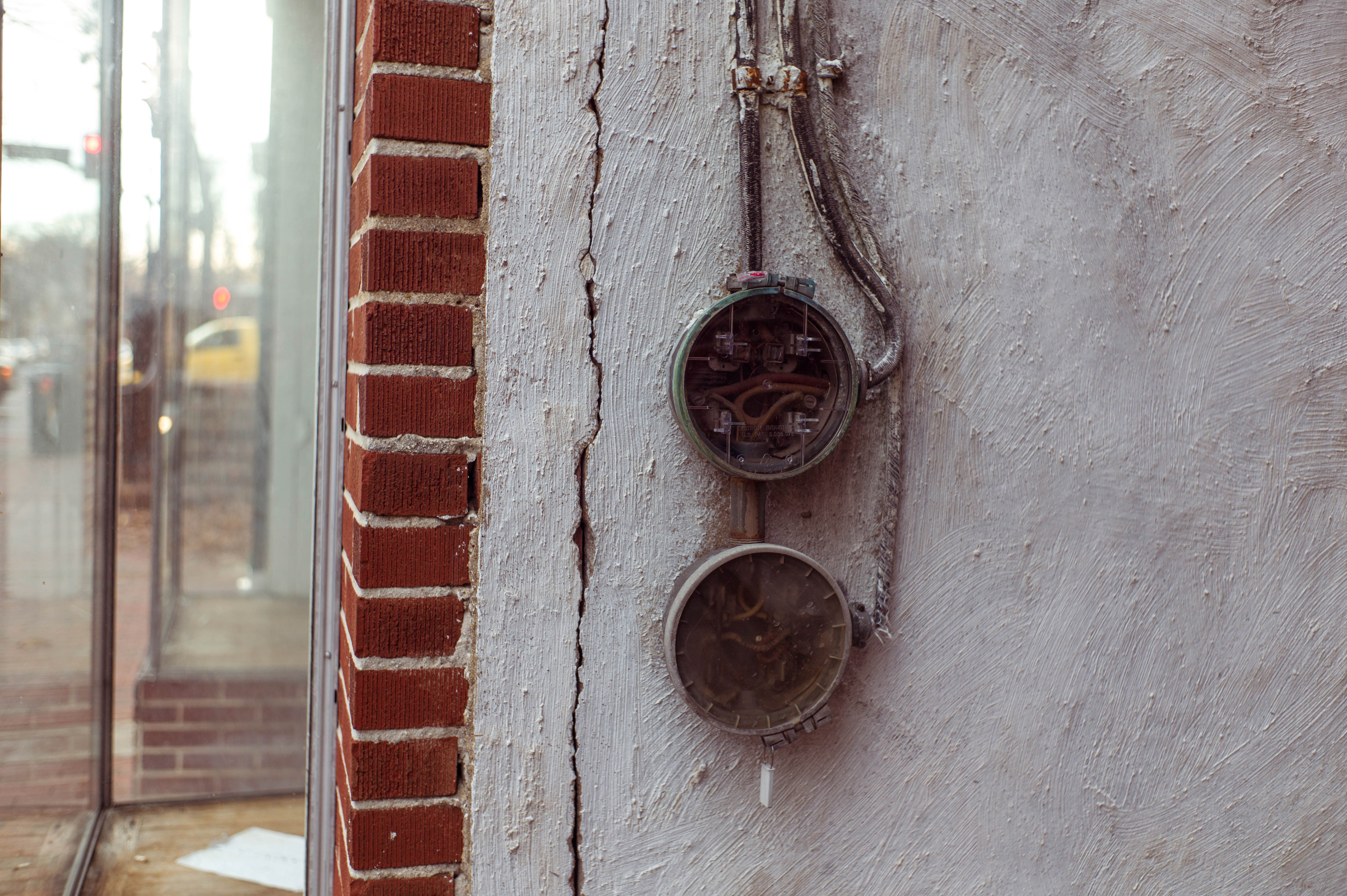 Against a backdrop of textured white plaster and red brick, two circular meters dangle from the wall, their transparent cases revealing intricate inner workings. The interplay of muted colors and soft natural light creates a melancholic yet intriguing atmosphere, highlighting the often-overlooked elements of urban life. The composition draws the eye, merging industrial functionality with a touch of artistry in the everyday.