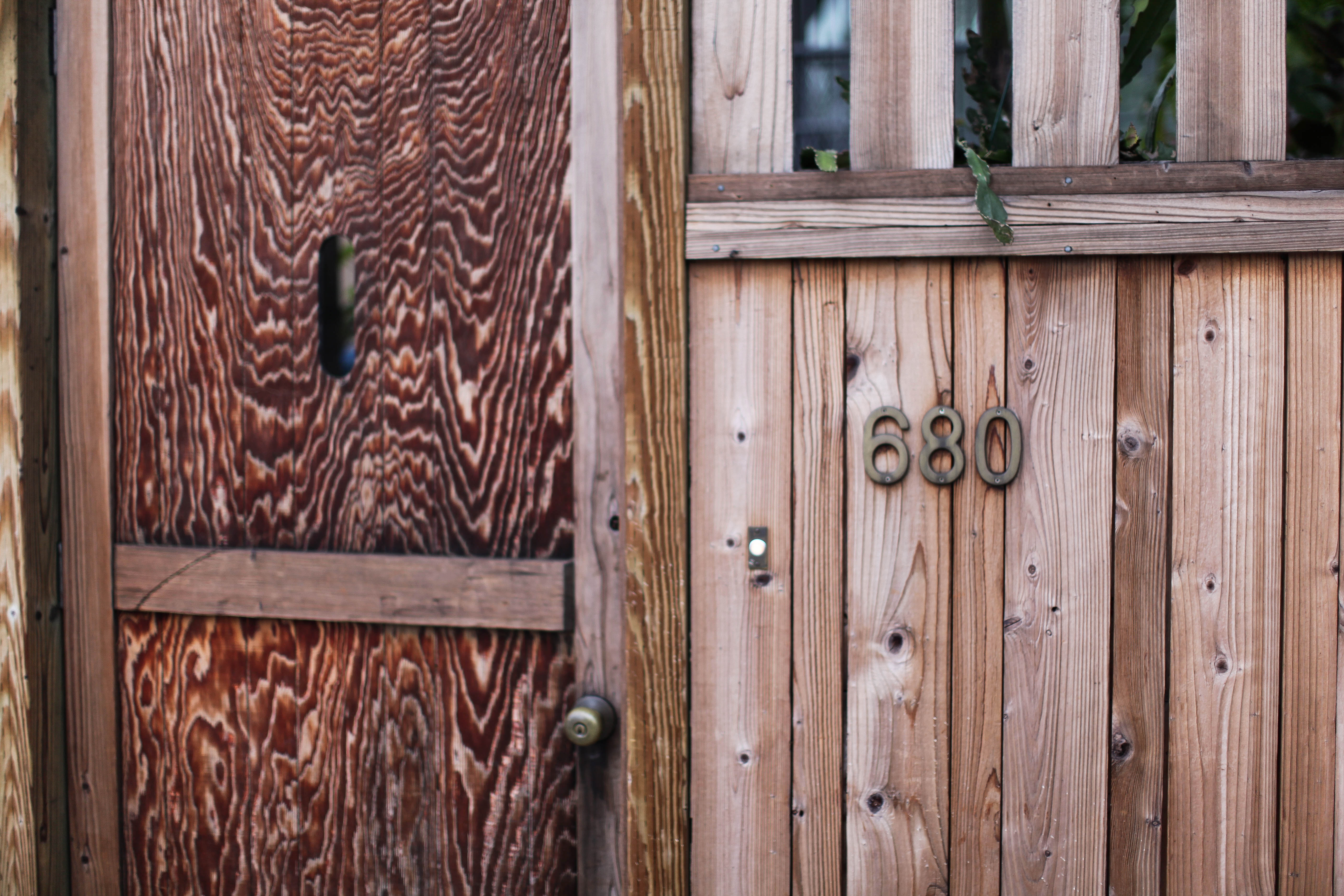 The photograph captures a weathered wooden door, rich in texture and history, juxtaposed against a lighter fence panel marked with the number '680'. Soft, diffused lighting envelops the scene, casting gentle shadows that enhance the rustic charm of the wood. This inviting yet mysterious entrance evokes a sense of curiosity and warmth, beckoning the viewer to imagine the stories hidden behind its threshold.
