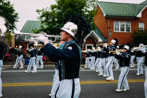 In this vibrant parade scene, a youthful trumpet player takes center stage, fully immersed in the rhythm of the band. The soft, overcast lighting creates a uniform mood, enhancing the ensemble's blue and white uniforms against the backdrop of a quaint street. The composition captures a moment of camaraderie and discipline as the marchers flow together, celebrating tradition and artistry in motion.