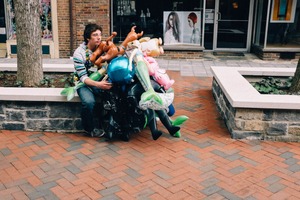 A young man sits slumped against a stone planter, overwhelmed by a colorful pile of balloons that spill over him like a whimsical burden. The muted tones of the surrounding urban landscape contrast with the vibrant balloons, creating a melancholic yet playful mood. Soft, diffused light casts gentle shadows, highlighting the man's contemplative expression amid a scene that's both surreal and striking.