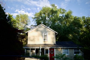 Bathed in warm afternoon light, this charming house stands as a quiet sentinel among the surrounding trees. The inviting red door and lush greenery evoke a sense of comfort and nostalgia, while the soft clouds overhead add to the serene atmosphere. The careful composition highlights both the structure and its natural embrace, creating a harmonious blend of man-made and organic beauty.