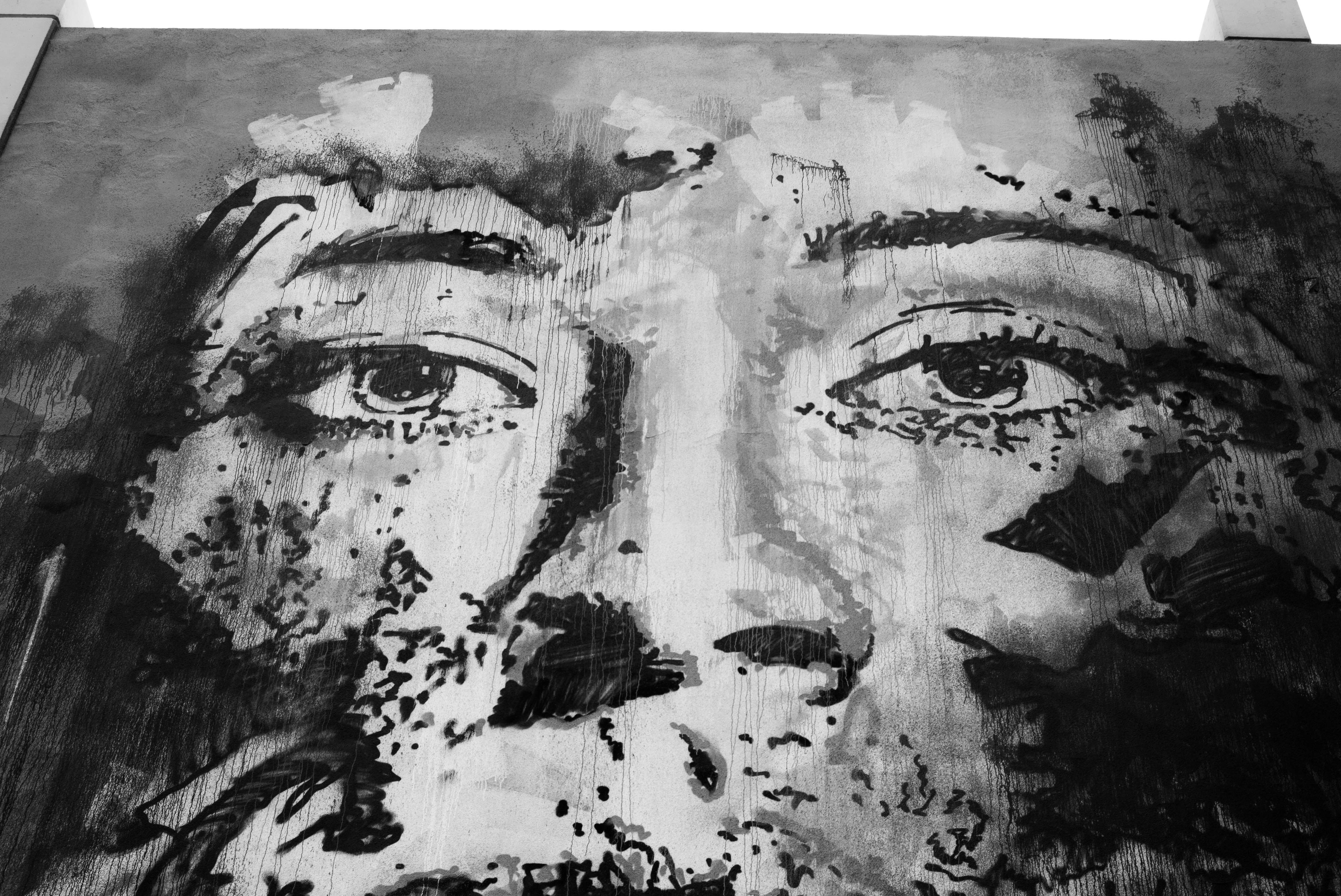 A striking black and white mural captures a close-up of a face, with intense eyes that convey deep emotion. The composition is bold, marked by fluid brushstrokes and drips that add a sense of movement and texture. Soft yet dramatic lighting highlights the contours of the face, creating a haunting but captivating mood.