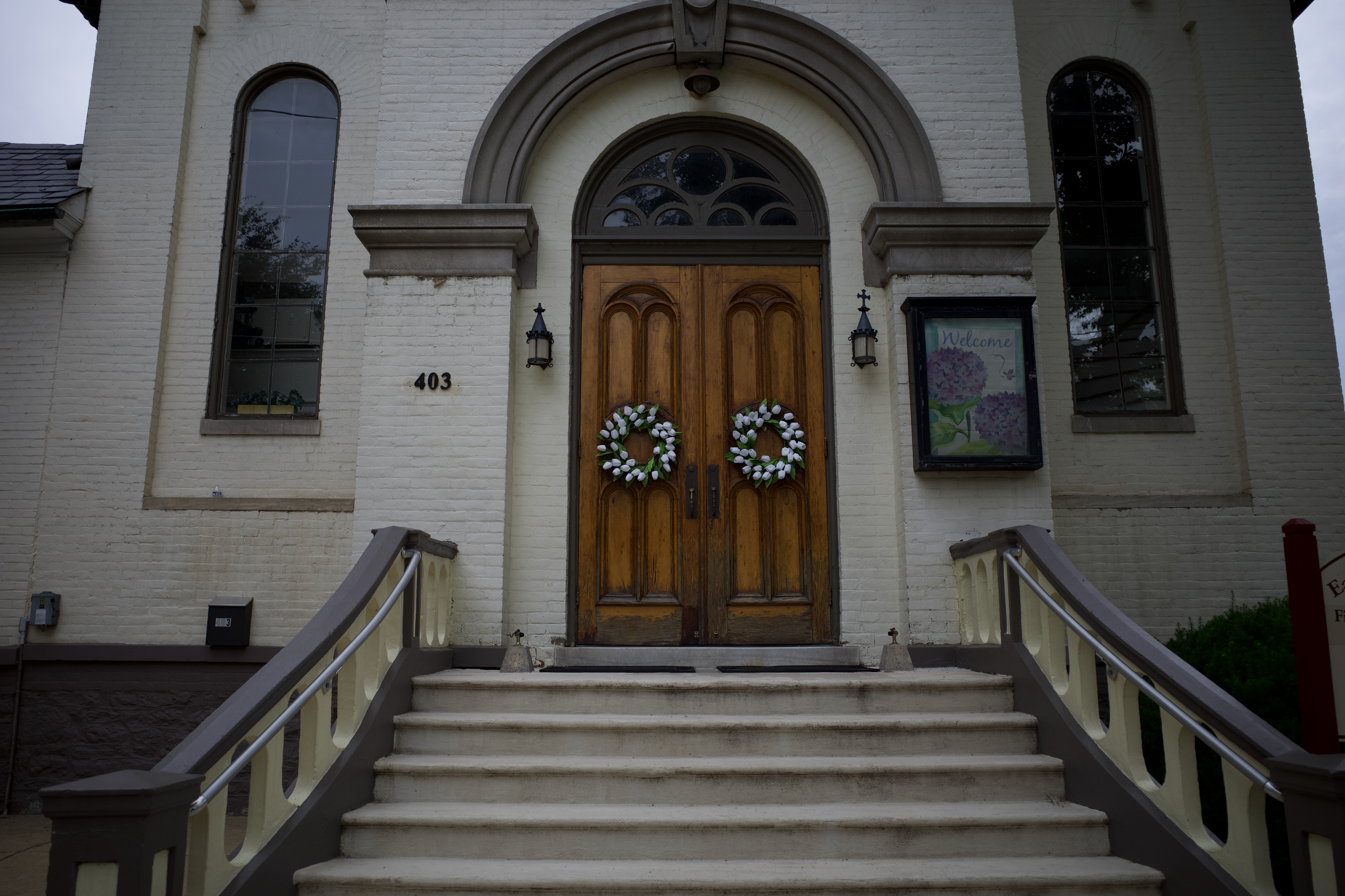 The photograph captures a quaint, welcoming church entrance, marked by large wooden doors adorned with floral wreaths. The subdued lighting and overcast sky evoke a sense of calm and tranquility, inviting visitors to step inside. The elegant staircase leads up to the doors, enhancing the architectural charm of the building.