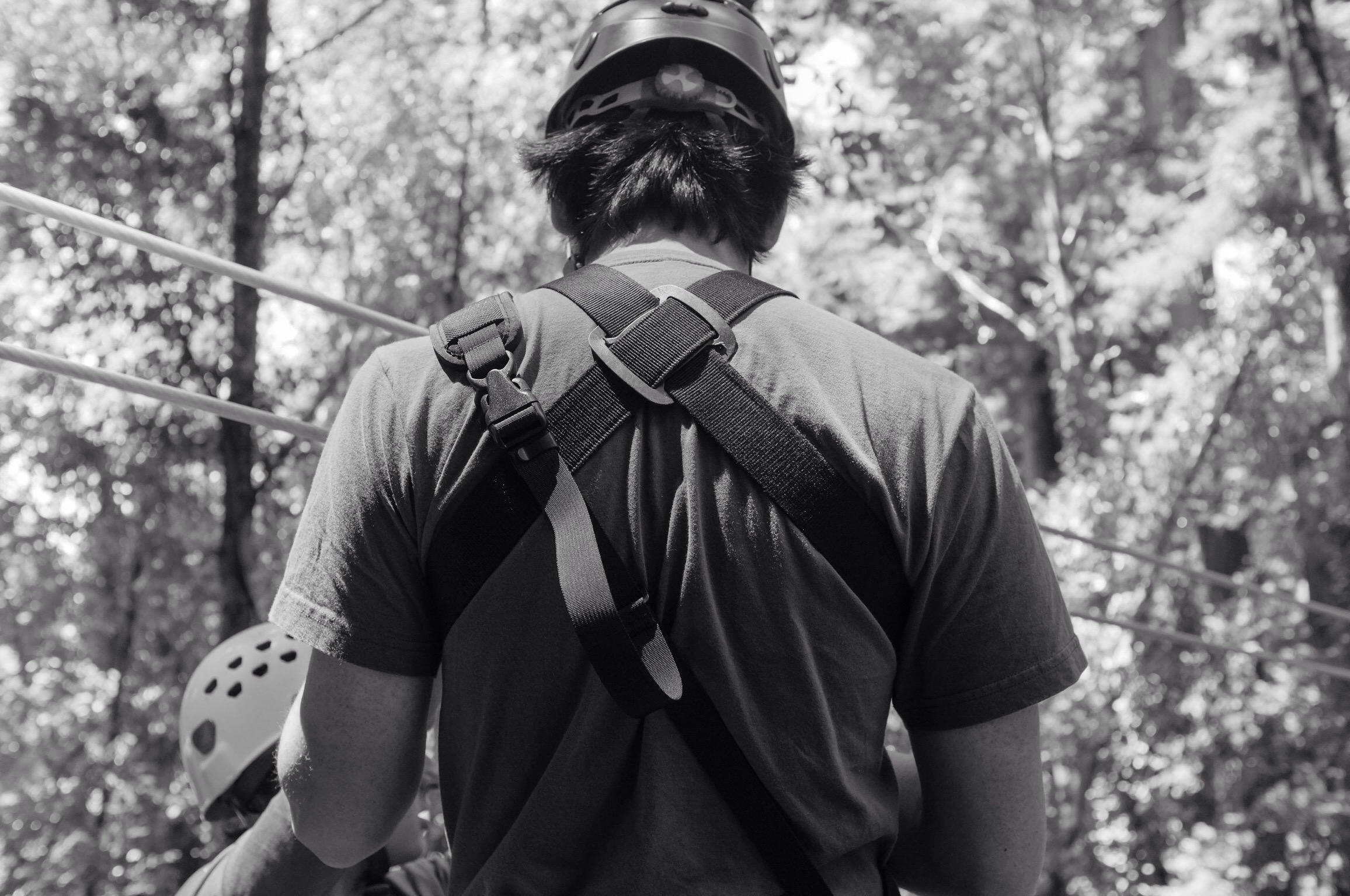 The photograph captures a climber from behind, clad in a harness and helmet, poised beneath the dappled sunlight filtering through a thick canopy of trees. The stark black-and-white contrast highlights the textures of the equipment and the serenity of nature, creating a mood of anticipation and adventure. The composition draws the viewer's eye upwards, suggesting the ascent that lies ahead.