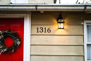 The photograph captures a cozy home entrance, anchored by a vibrant red door adorned with a lush green wreath. Soft, warm light spills from a vintage-style lantern, creating a welcoming ambiance against the muted tones of the exterior. The numbering, bold and simple, enhances the charm, inviting guests to feel at home.