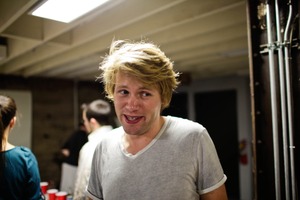 In a lively basement setting, a young man with tousled blond hair wears a playful expression, exuding a mix of humor and slight mischief. The soft overhead lighting enhances the casual yet intimate atmosphere filled with indistinct figures in the background, suggesting a gathering of friends. The composition draws focus to the subject, encapsulating a moment of carefree joy amidst the chatter of a social gathering.