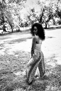 In a sun-drenched field, a young woman poses gracefully with her back turned, exuding an effortless elegance. The interplay of light and shadow creates a soft, ethereal atmosphere, emphasizing the intricate patterns of her flowing attire. Her calm demeanor contrasts with the lively backdrop of trees, inviting a sense of serene introspection.