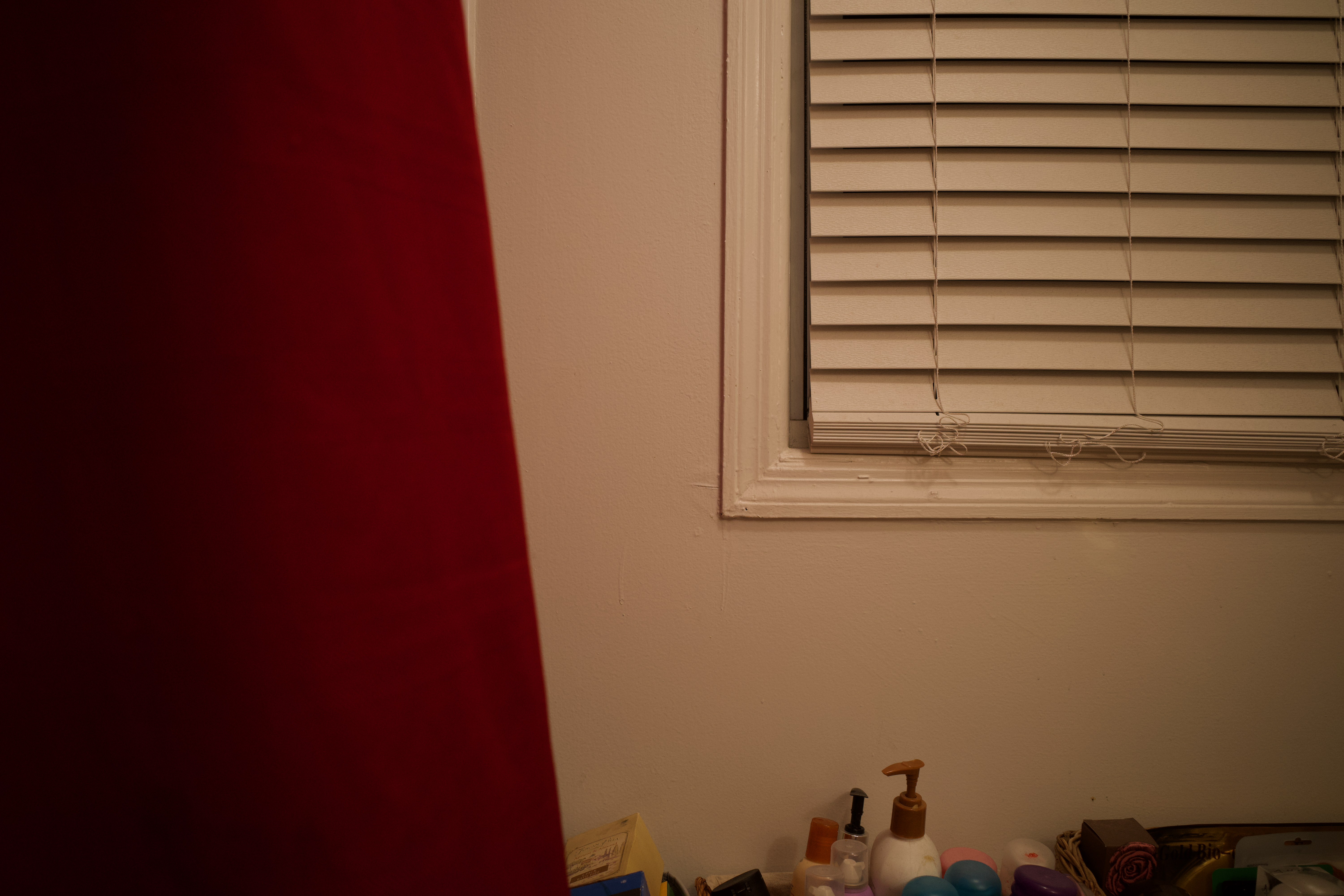 This photograph captures a corner of a bathroom, where a rich red curtain softly contrasts with the pale wall and blinds. The mood is intimate and inviting, evoking a sense of personal space and reflection. The subdued lighting highlights the array of toiletries on the counter, hinting at daily rituals and moments of self-care.