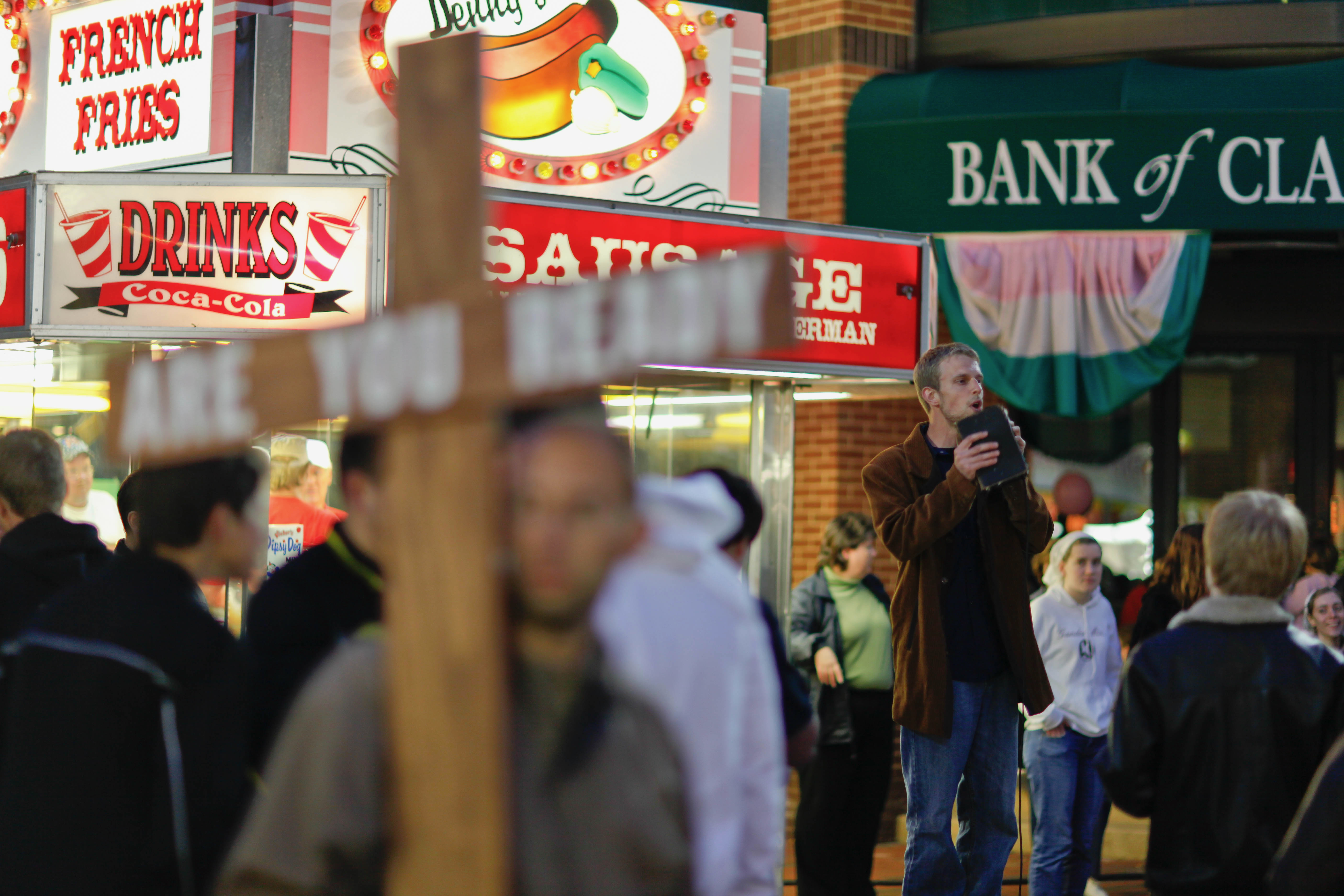 The photograph captures a bustling street scene where a man holding a wooden cross stands at the forefront, contrasting with the vibrant food stalls behind him. The soft glow of the streetlights casts a warm light on the crowd, creating an atmosphere of reflection amid the lively chatter and bright neon signs. The composition juxtaposes the spiritual message of the cross with the consumerism of the surroundings, inviting contemplation on faith and everyday life.