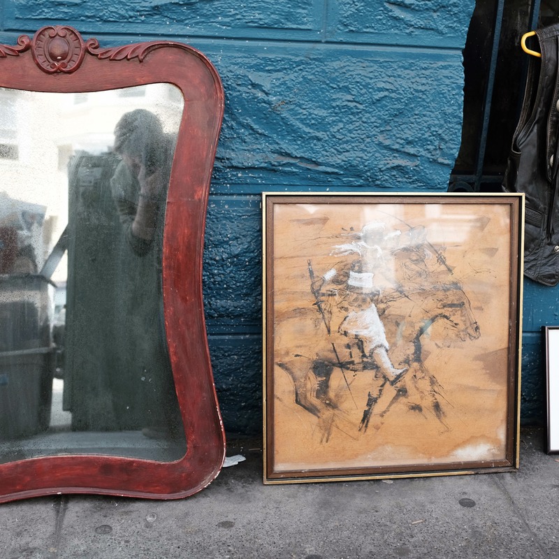 A vintage mirror and art piece nestle against a textured blue wall, exuding a sense of nostalgia. The soft light enhances the muted colors, casting gentle reflections and inviting a contemplative mood. This still life scene captures a moment of quiet history, filled with stories waiting to be told.