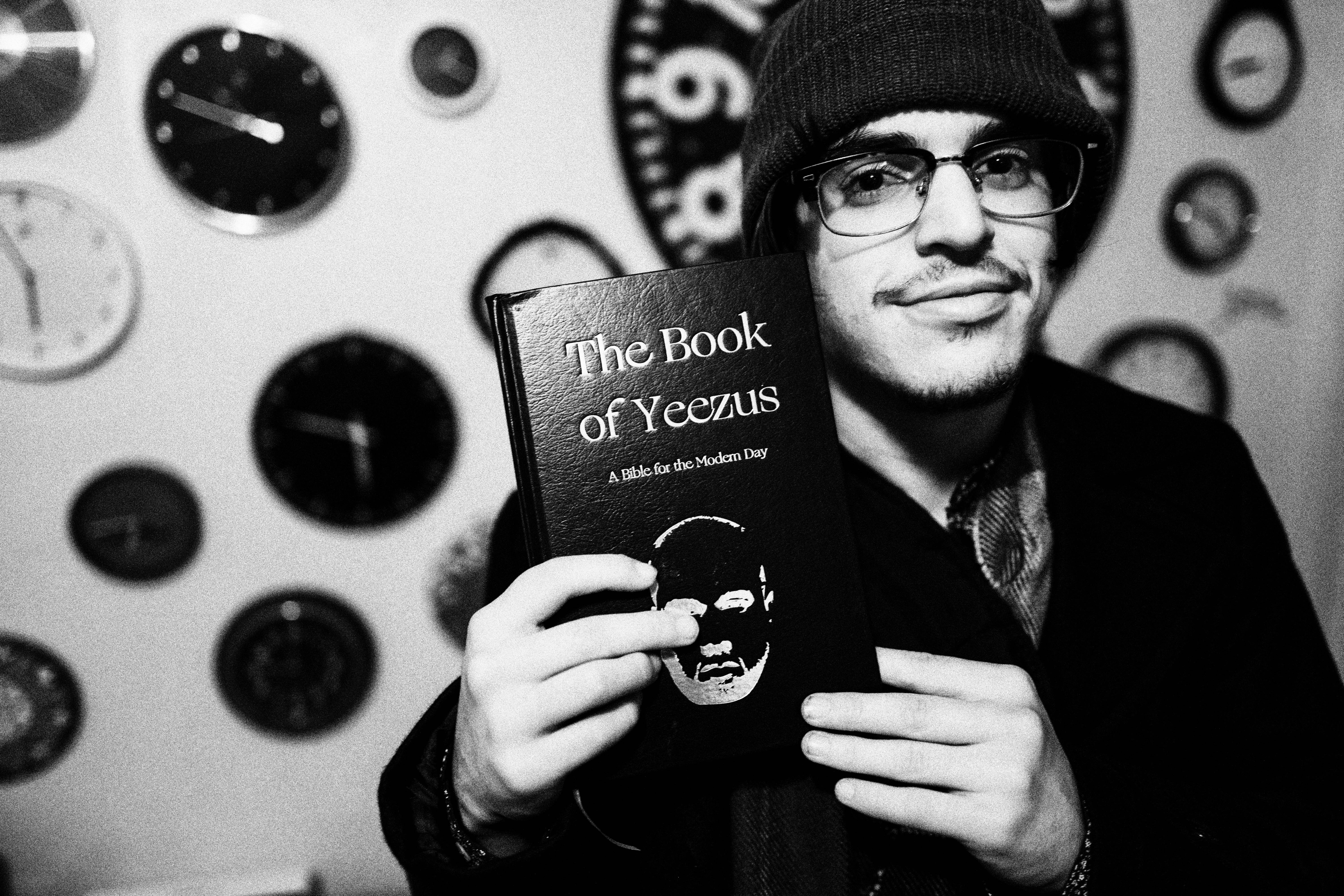 In this striking black and white photograph, a young man holds up 'The Book of Yeezus,' juxtaposed against a backdrop of diverse clocks that suggest the passage of time. His expression is playful yet defiant, embodying a contemporary cultural critique. The dim, moody lighting enhances the sense of intrigue and urgency, drawing attention to both the subject and the provocative text.