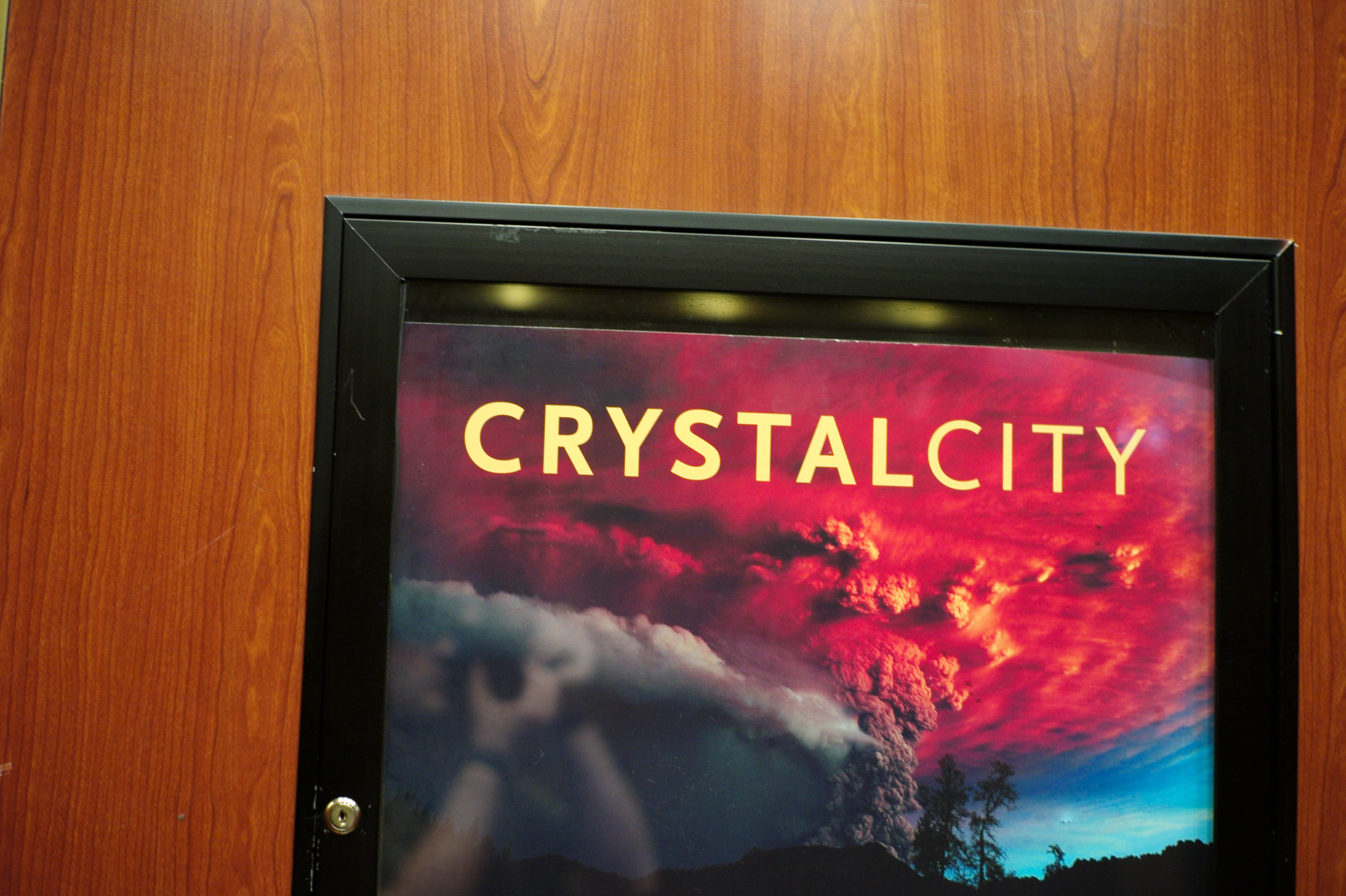 This photograph captures an urban poster featuring the bold title 'CRYSTAL CITY' against a backdrop of vivid colors reminiscent of a sunset or volcanic eruption. The juxtaposition of the vibrant hues against the warm wooden frame creates an inviting yet dynamic mood, while the slight reflection and finger hints at an observer engaged with the scene. The composition draws the eye, offering a glimpse of adventure and energy within the urban landscape.