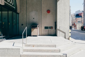 This photograph captures a stark urban scene, highlighting a lone trash can against a textured concrete wall. The soft sunlight creates a calm yet desolate mood, emphasizing the emptiness of the space. A few muted colors and shadows add depth, inviting contemplation of the often overlooked details of city life.