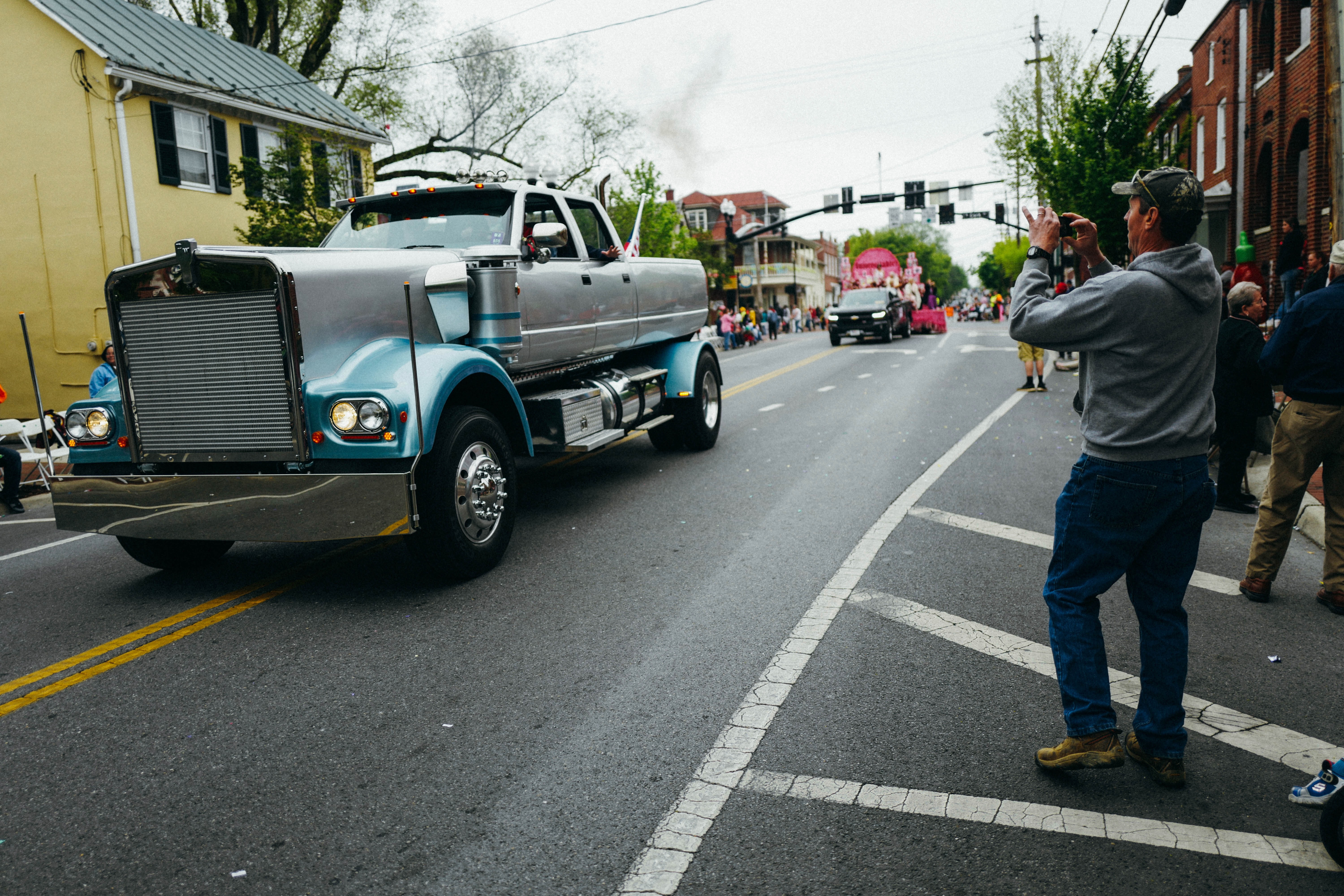 A striking vintage truck cruises down the street, capturing the attention of onlookers during a lively parade. The mood is festive yet nostalgic, with overcast skies casting a soft, diffused light over the scene. A spectator in the foreground, camera in hand, adds a personal touch to the vibrant atmosphere of community celebration.