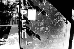 This photograph captures a blackboard door adorned with playful chalk drawings and motivational quotes, exuding a sense of creativity and warmth. The interplay of light and shadow adds depth, while the vibrant yet monochromatic textures evoke a contemplative mood. The openness implied by the door invites a journey into a space dedicated to yoga and mindfulness, inviting passersby to embrace both practice and self-forgiveness.