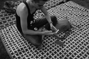 A young man sits cross-legged on a patterned blanket, absorbed in his phone. The monochromatic tones evoke a sense of quiet introspection, contrasting the vivid design beneath him. Casual and serene, the scene captures a moment of solitude amid a lively outdoor setting.