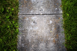 A close-up view of a weathered concrete sidewalk bordered by lush green grass. The composition evokes a sense of tranquility and nature, with scattered markings on the pavement hinting at stories both seen and unseen. Soft, diffused lighting enhances the textural details of the concrete and the vibrant greenery, inviting contemplation on the simple beauty of everyday paths.