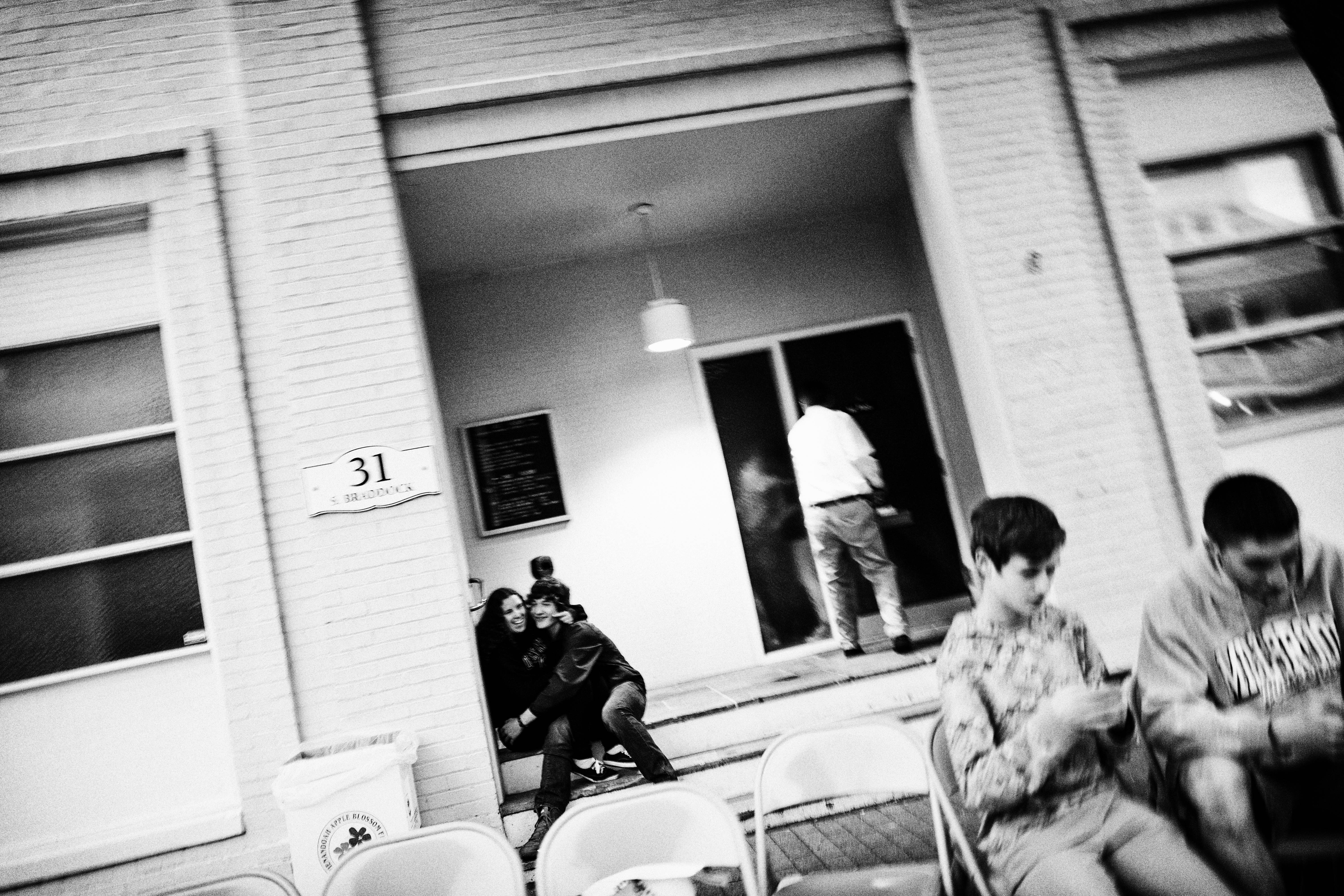 In a candid capture, two figures share a tender moment, nestled together against a backdrop of stark architecture. The black-and-white tones lend a timeless quality, enhancing the emotional warmth against the surrounding coolness. The varied expressions and postures of the individuals in the foreground contrast with the distant characters, creating a dynamic yet intimate scene.