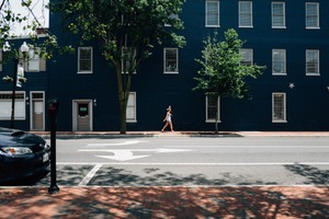 A lone figure walks along a quiet street, framed by a striking deep blue building and vibrant greenery. The composition emphasizes the serenity of the moment, with soft sunlight creating a warm ambiance. Shadows play on the pavement, enhancing the peaceful mood of this urban setting.