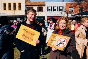 Amid a crowd rallying for gun control, two determined participants stand prominently, holding their vibrant signs aloft. The bright sunlight casts a warm glow on their faces, juxtaposing the serious message they convey, creating a poignant blend of hope and resolve.