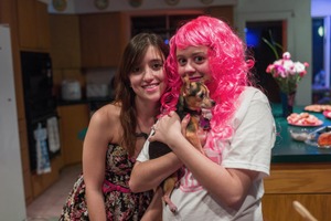 This photograph captures a lighthearted moment between two young women, one wearing a bright pink wig, both smiling warmly as they pose with a small dog. The kitchen setting conveys a cozy atmosphere, enhanced by warm lighting and a hint of playful chaos from food spread across the counter. Their expressions radiate joy and friendship, creating an inviting and cheerful mood.