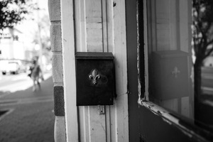 The photograph captures a vintage mailbox adorned with a fleur-de-lis, set against a faded wooden door and soft reflections. The monochrome palette evokes a sense of nostalgia, highlighting the charm of everyday life as a passerby drifts into the background, captured in motion. Gentle natural light illuminates the scene, enhancing textures and drawing attention to the contrasting elements of stillness and motion.